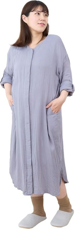 しっかりと厚みのある生地と長め丈のデザインにより、ワンピース1枚でも着用可能です。着替えやすい前開きタイプで、産院着としてもぴったり。第2〜4ボタンはスナップ仕様のため、授乳時にサッと胸元を開けられます。産後まで長く使えるおすすめのアイテムです。