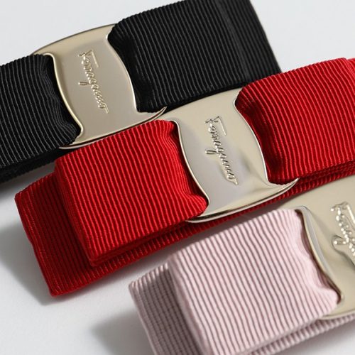 フェラガモのアイコニックなモチーフ「ヴァラ」が取り入れられた、高級感のあるリボンバレッタです。中央のゴールド金具がアクセントとなり、コーデ全体を上品に引き締めます。
