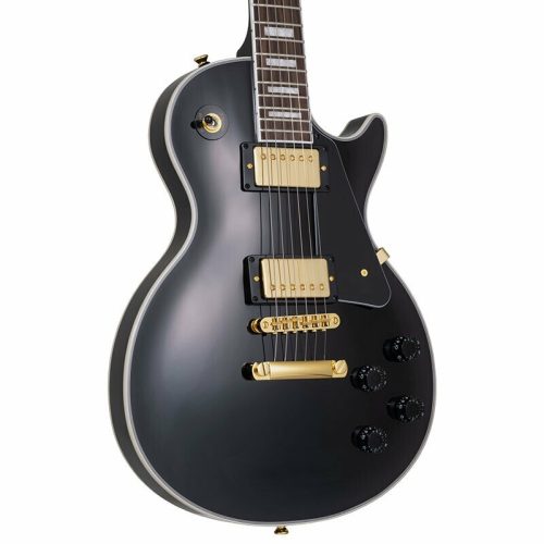 レスポールカスタムタイプのエレキギター。ブラックのボディにゴールドのパーツを採用しており、高級感を演出しています。ボディサイドの白いラインも魅力です。また、リーズナブルな価格帯ながら、本格的なセットネック仕様で仕上げています。