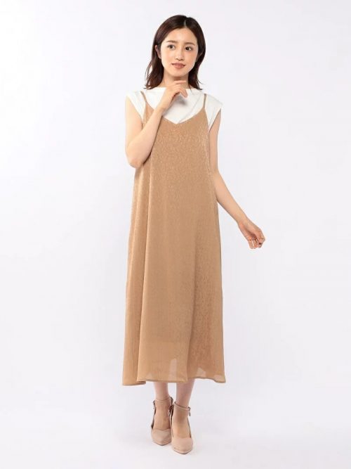 花柄ジャガード生地を採用したキャミワンピースと、シンプルなインナーのセットです。花柄ワンピースは控えめかつ落ち着いたデザインで、普段使いしやすいのが魅力。色や柄の主張が強い花柄ワンピースに抵抗がある方でも、着用しやすいアイテムです。
