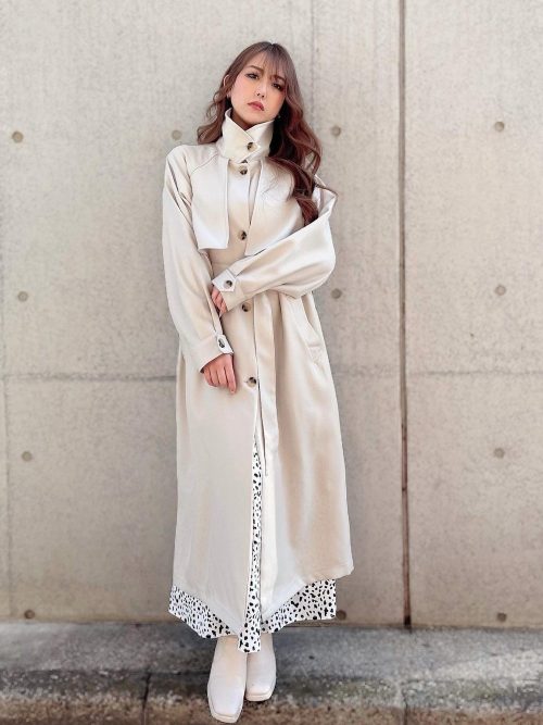 ホワイトのスタンドカラーコートが目を引く、フェミニンなコーディネート。ベージュのコートから、ホワイトをベースにしたスカートをチラ見せさせ、優しい色合いでまとめています。ブーツもホワイト系でトーンを揃えており、かわいらしさのなかに大人っぽさもある着こなしです。