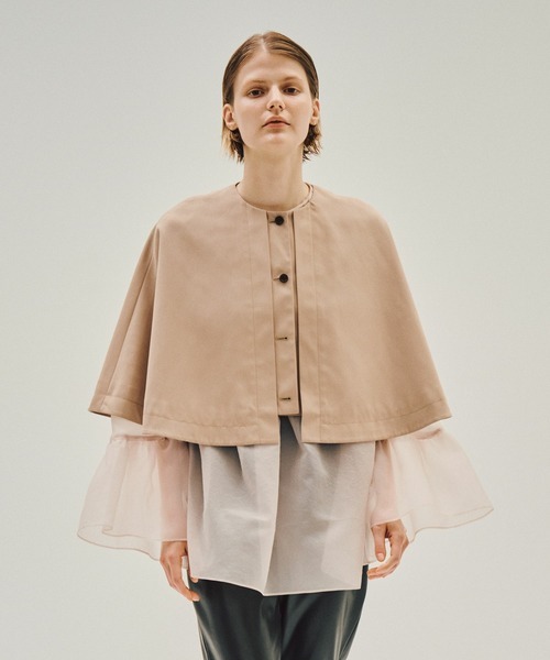 ふんわり広がるケープがシンプルなインナーと合わせるだけで華やかさを演出。コンビワンピースと組み合わせてカジュアルに、ドレスと合わせてフォーマルにと多彩な着こなしが楽しめます。女性らしいやわらかな雰囲気を求める方におすすめのアイテムです。