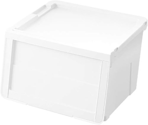 大きな開口部で出し入れしやすい前開き収納ケース。スライド式の蓋を本体内部に格納できる設計で、開けたままの状態を保てるのが魅力です。洋服を重ねたまま取り出せるため、クローゼットでの衣類整理に適しています。