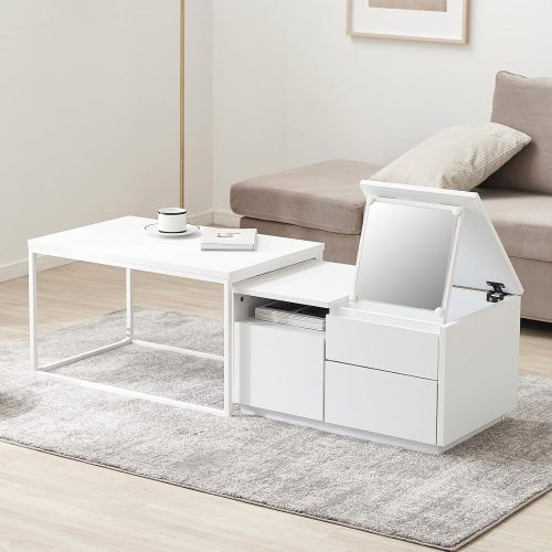 2台のテーブルが重なる省スペース設計のローテーブル。大きなテーブルと小さなドレッサーがセットになっており、使用しないときはコンパクトに収納できます。ドレッサーとしても普段使いのテーブルとしても活用できるのが魅力。ドレッサーには引き出し収納や開き戸が付いており、化粧品やアクセサリーの整理に便利です。