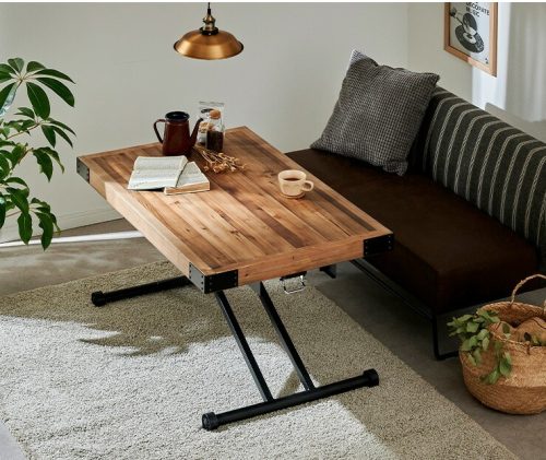 古材の風合いが味わい深い昇降テーブルです。天板に表情豊かなパイン無垢材を採用しているのが特徴。ブラックスチールを組み合わせたヴィンテージ調のデザインが、空間をおしゃれに演出します。
