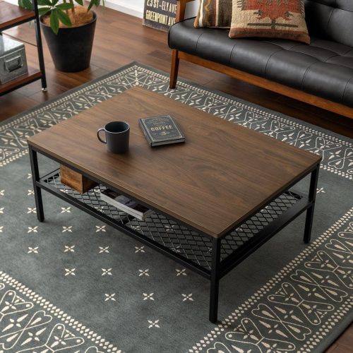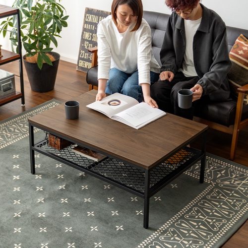 リアルな木目とスチールの組み合わせが魅力的なローテーブル。インダストリアルデザインを採用し、カフェのような無骨でおしゃれな空間を演出できます。ワイヤーメッシュの収納棚がアクセントとなり、雰囲気のある部屋づくりが可能。収納棚にはリモコンや本を整理でき、テーブル周りをすっきりと保てるのが魅力です。