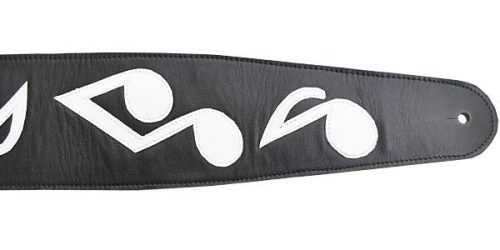 完全ハンドメイドによるギターストラップです。品質の高さが魅力。素材は本革で、かわいらしい音符がデザインされているものの、高級感があります。