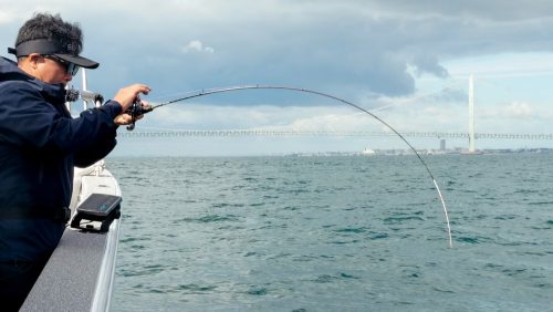 タイラバで釣るコツはアタリが出たら即アワセをせずに巻き続けること。巻き続け、マダイが下に突っ込んでからアワセるくらいが目安です。