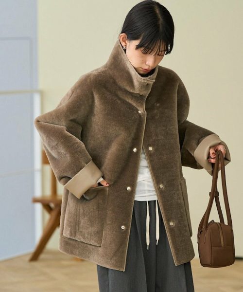 左右にポケットを備え、袖口は折り返して着用することも可能。サンドベージュ・ブラック・ライトグレーの3色を展開しています。シックなカラーがエレガントな雰囲気を演出し、冬のおでかけをランクアップさせたい方におすすめです。