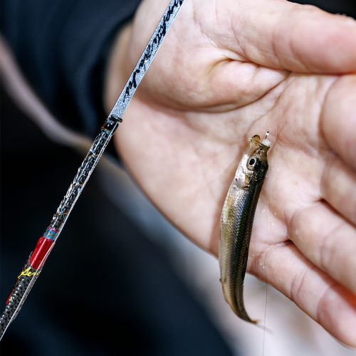 竿の構えやモーションも小さいので、竿の自重もかなり軽め。また、ワカサギはエサへの喰いつきも微弱なので、それを見逃さないように竿は柔らかい素材で作られています。