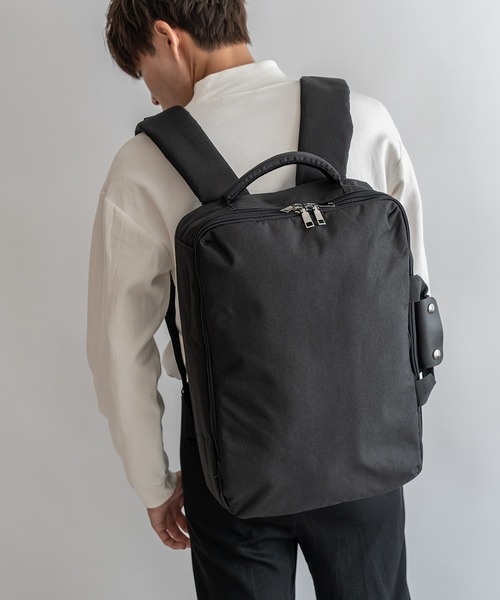容量22Lのブリーフケースです。ビジネスシーンはもちろん、1泊程度の出張にも使えるサイズ感。手提げのほか、肩にかけたり背負ったりできるのも特徴です。また、背面にキャリーバーを通せるスリットが付いています。