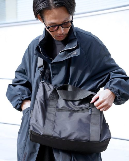 軽量で撥水性のある生地を使用しているトートバッグ。止水ファスナーを使用しているので、小雨が降ったときでも安心して使えます。ショルダーストラップが備わっており、2Wayで使えるのも特徴です。