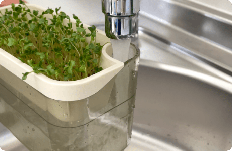 グリーンインテリアにもなるスプラウト栽培ポット。水替えしやすい給水口を設けており、毎日の手入れが簡単にできるのが特徴です。透明な下ケースで根の成長過程を観察できるほか、給水ラインもわかりやすく確認できます。