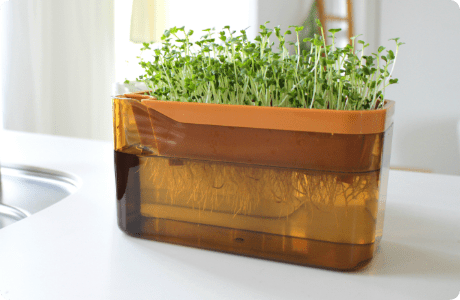 専用の育成容器と育苗トレイが根の成長をサポート。太陽光と室内灯の組み合わせで季節を問わず1年中栽培できます。種植えと水やりのみのシンプルな作業なので、初めて水耕栽培を試したい方におすすめです。