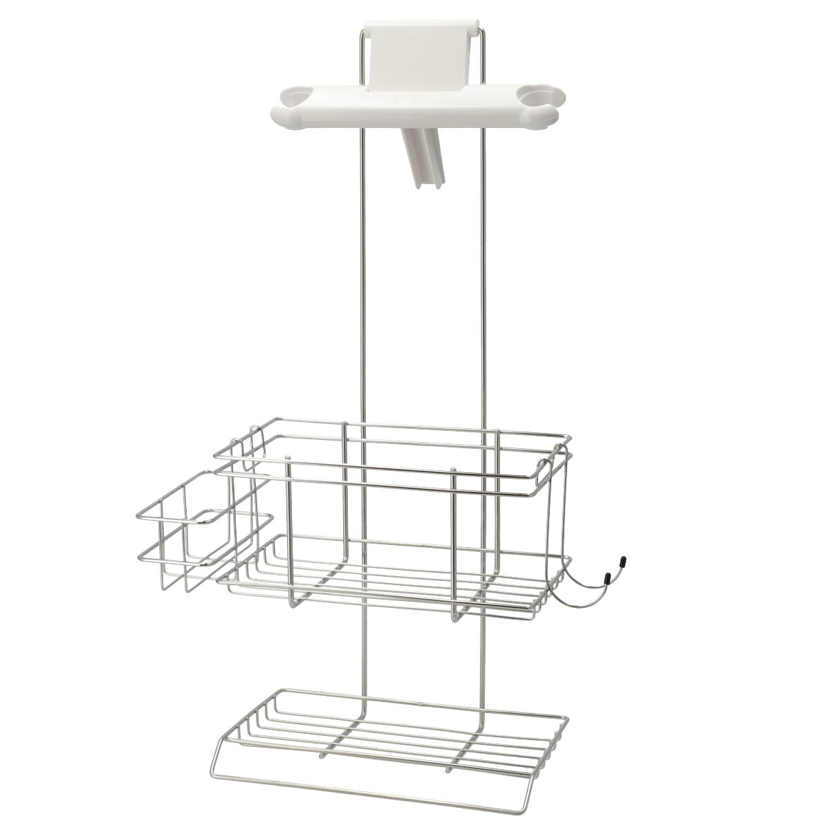 水栓の金具やタオルラックに引っ掛けて使えるシャワーラックです。ボトルの収納に適した深さのある棚と石鹸置きに便利な浅めの棚、スポンジ類の吊り下げに役立つフック2つを搭載しています。