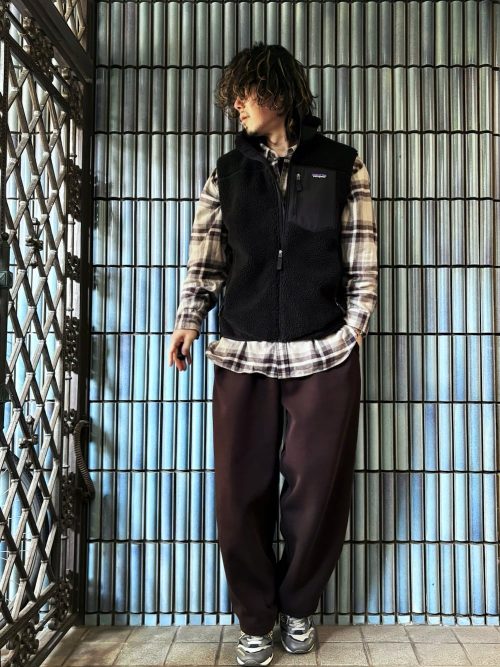 黒のパタゴニアフリースベストを組み合わせた、秋らしいあたたかみのあるコーディネートです。インナーにはベージュ系のチェック柄シャツを合わせ、カジュアルながらも落ち着いた雰囲気を演出。首元のレイヤードもポイントです。