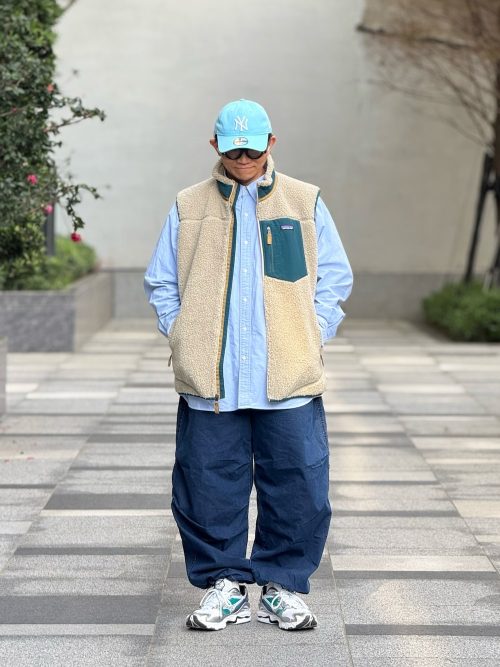 パタゴニアのフリースベストを主役にした、カジュアルなアメカジスタイルです。インナーには爽やかなライトブルーのシャツを合わせ、重たくなりがちな冬コーデに軽さをプラス。ボトムスはネイビーのワイドパンツを選び、リラックス感のあるシルエットにまとめています。
