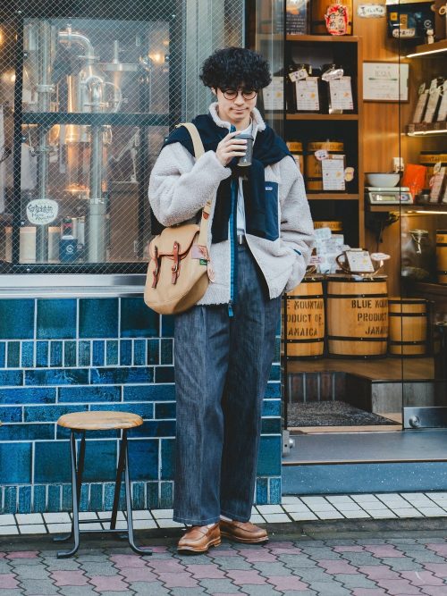あたたかみのあるカジュアルコーデです。ボリューミーなパタゴニアフリースのボア素材が季節感を演出。ボトムスにはワイドなデニムパンツを合わせ、ゆったりとしたリラックス感を漂わせています。