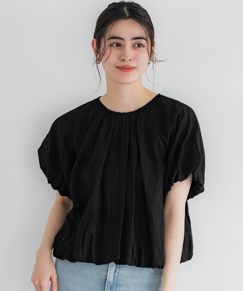 透け感のあるコットン生地にレースがほどこされたブラウス。レースがさりげなく入っている、ほんのりフェミニンなテイストが入った涼しげなデザインが魅力です。