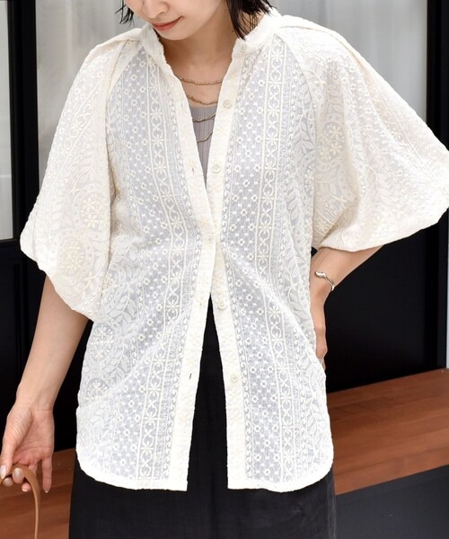 羽織りとしても使えるレースブラウスです。適度な透け感のある幾何柄で、フェミニンになりすぎないのが魅力。開襟シャツをベースにしたゆったりとしたシルエットのため、1枚でも羽織りでも使えるアイテムです。