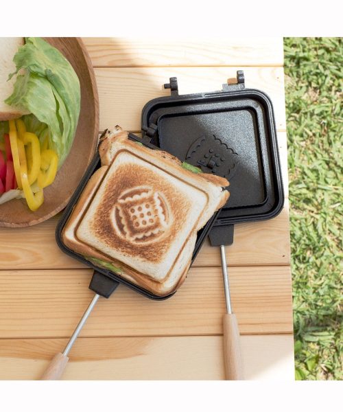 耳付きパンをそのまま挟んで焼ける、直火専用のホットサンドメーカー。具材をたっぷり入れても美味しく仕上がりやすいのが魅力です。焼き上がると程よい焦げ感とともにブランドロゴが印字され、見た目も楽しめます。
