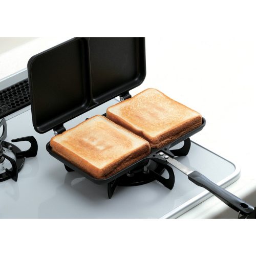 ガス火で一度に2個焼ける直火式ホットサンドメーカー。内面にふっ素樹脂加工を施しているため焦げ付きにくく、できあがったホットサンドをきれいに取り出しやすいのが魅力です。