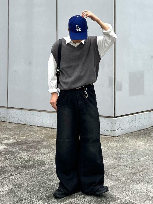 グレーのニットベストにワイドデニムパンツをあわせたカジュアルコーデです。インナーにはシンプルな白シャツをレイヤード。全体的にラフなシルエットで仕上げ、抜け感を演出しています。程よく上品にまとまった、おすすめのコーデです。