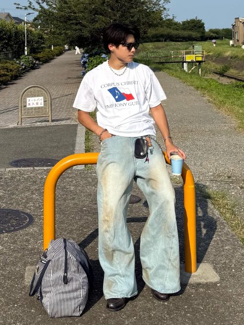 ユーズドライクなジーンズがこなれ感を際立たせる、夏のメンズコーデです。トップスには、爽やかな白のロゴ入りTシャツをチョイス。ウエスト部分にコインケースやウォレットチェーンを重ね付けすることで、シンプルすぎない装いに仕上げています。