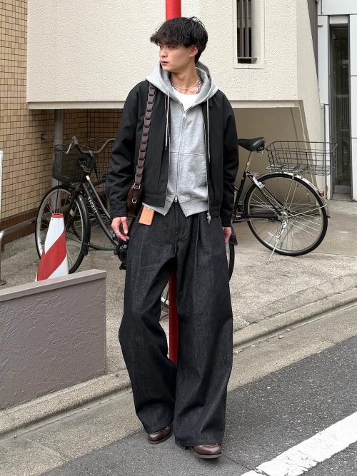 インナーのジップパーカーがアクセントのメンズコーデです。色合いのコントラストをつけることで、奥行きのある印象に仕上げています。加えて、短めのトップスにボリュームのあるワイドデニムをあわせ、Aラインシルエットを演出しているのもポイント。程よくラフでトレンド感のある、おすすめのコーデです。