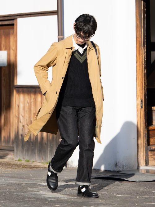 ベージュのステンカラーコートに、濃紺のデニムパンツをあわせたきれいめカジュアルコーデです。インナーにはチルデンニットベストと白シャツをレイヤードし、プレッピーな雰囲気を演出しています。コントラストを活かしつつ上品な印象に仕上げた、おすすめのメンズコーデです。