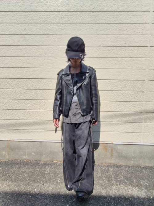 黒のライダースジャケットを主役にしたモード感のあるコーディネートです。ボトムスにはボリュームのあるワイドパンツを合わせ、上半身はややタイトに下半身はルーズなシルエットを構築。インナーのグレータンクトップが、着こなしに奥行きを加えています。