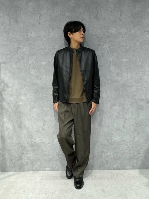ハードな印象になりがちなレザージャケットも、アースカラーでまとめることで上品な印象に仕上がります。足元は黒のレザーシューズでコーデ全体を引き締め、統一感のあるスタイリング。きれいめながらもモードな雰囲気が漂う着こなしです。