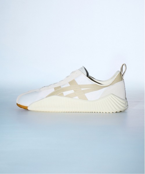 ファブリックとレザーを組み合わせた、ヴィンテージライクなベージュスニーカーです。陸上スパイクを手本に、ボリューム感と軽量さを兼ね備えたアイテム。オニツカタイガーのラインデザインも特徴です。