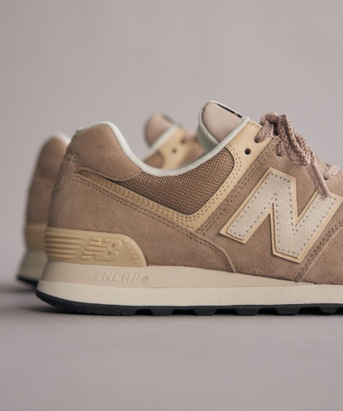 ブランドのアイコニックモデル「574」をベースにしたスニーカー。環境に優しいサステナブルなマテリアルを採用し、季節感のあるスエードとメッシュのアッパーをベージュのオーセンティックなカラーで彩っています。サイドのホワイトNロゴが映え、上品で洗練された印象です。