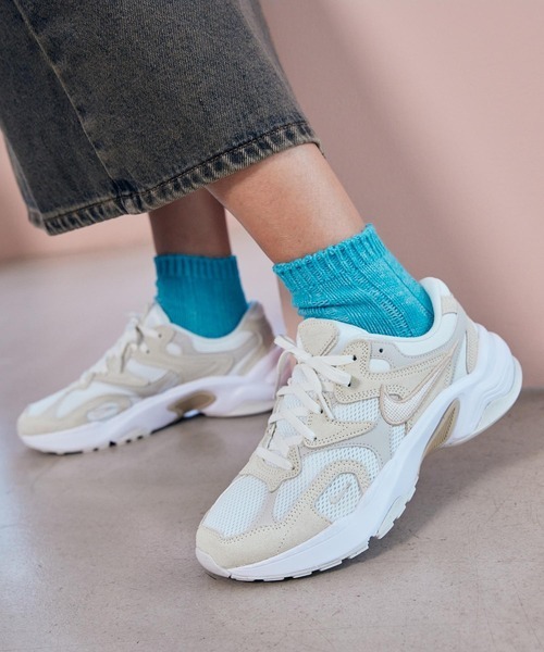 ブランドを象徴するスウッシュがアクセントになったベージュスニーカー。通気性のよいメッシュ素材に、レザーとスエードを組み合わせた立体感のある表情が魅力です。色味の異なるカラーをポイントで入れることでスタイリッシュな雰囲気に仕上げられています。