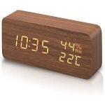 インテリアに自然に馴染む木目調のデジタル目覚まし時計です。LEDディスプレイには、時刻だけでなく温度や湿度も同時に表示可能。明るさを3段階で調節でき、0時~6時59分の間は自動的に一番暗い状態に切り替わるので、枕元に置いても眠りを妨げません。