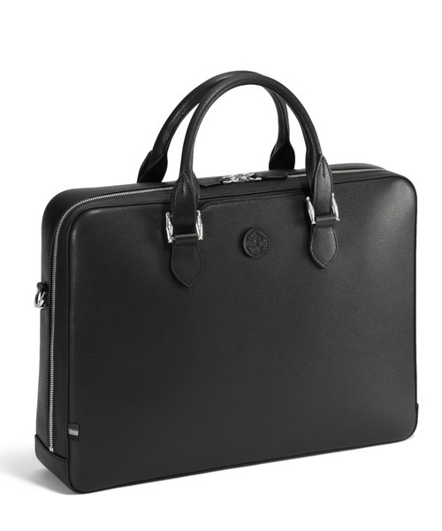 フルグレインのトリヨンレザーを使用した、高級感あふれるブリーフケースです。ブラックを基調とし、カッチリとした雰囲気を演出。フロント部分にはブランドロゴがエンボス加工でデザインされており、アイコニックな印象を与えます。