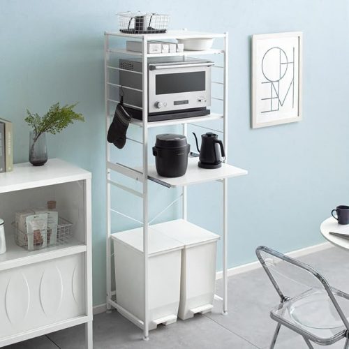 ゴミ箱上のデッドスペースを活用できるキッチンラックです。高さ89cm以下のゴミ箱に対応しており、フタ付きタイプでもスムーズに開閉できる設計。可動棚2枚とスライドトレーを備え、レンジから炊飯器まで幅広く収納できるのが魅力です。