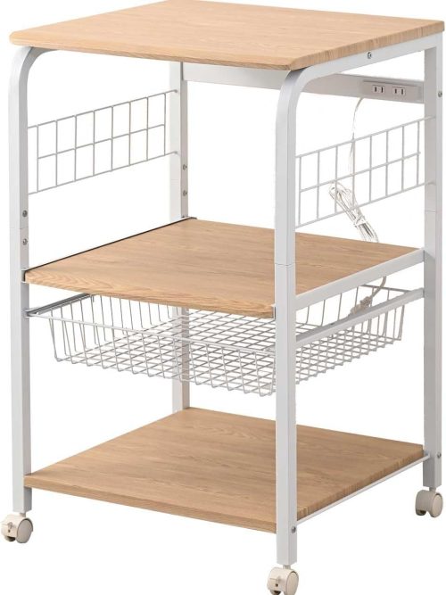 幅55.5×奥行55.5×高さ89cmの3段構成で、天板耐荷重は約20kgと大型レンジにも対応。また、スライド棚や2口コンセントを備えています。バスケットが付属し、小物収納にも活用可能。キッチン家電を1か所にまとめて収納したい方におすすめです。