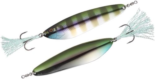 金属板の片面にベイトフィッシュライクな加工が施されたビッグスプーン。滑らかに回転するスイベルと刺さりのよいフックを採用しており、アクションの質とフッキング率の向上を図っているのが特徴です。