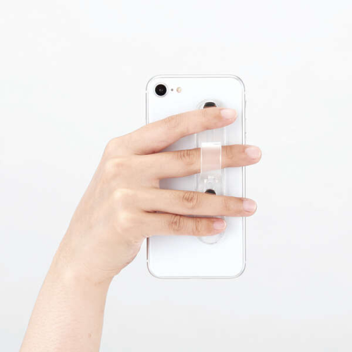 目立ちにくいクリアデザインを採用したスマートフォン用バンドです。透明素材で、スマートフォンのデザインを損なわないのがメリット。指を通して安全に持ち運べる構造です。