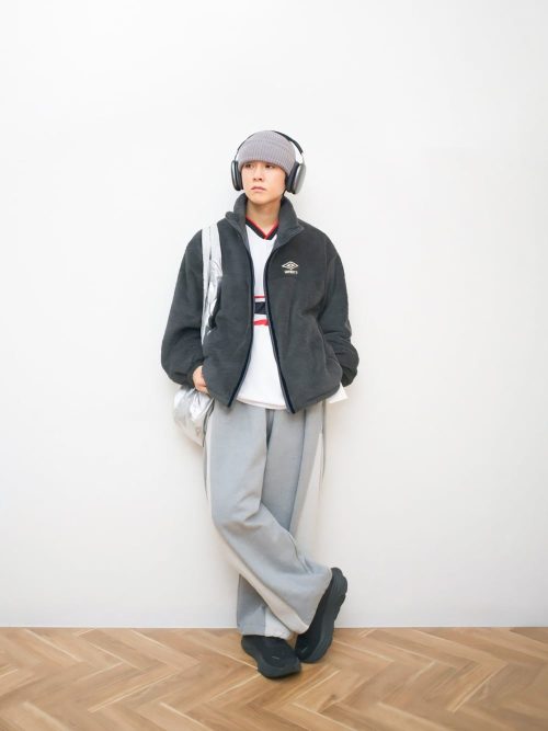 ボアジャケット・パンツ・ビーニーをグレーの濃淡でまとめた、統一感のあるメンズコーデです。インナーには、襟元のラインがアクセントのシャツをチョイス。ゆったりとしたボトムスと組み合わせ、ラフな雰囲気に仕上げています。