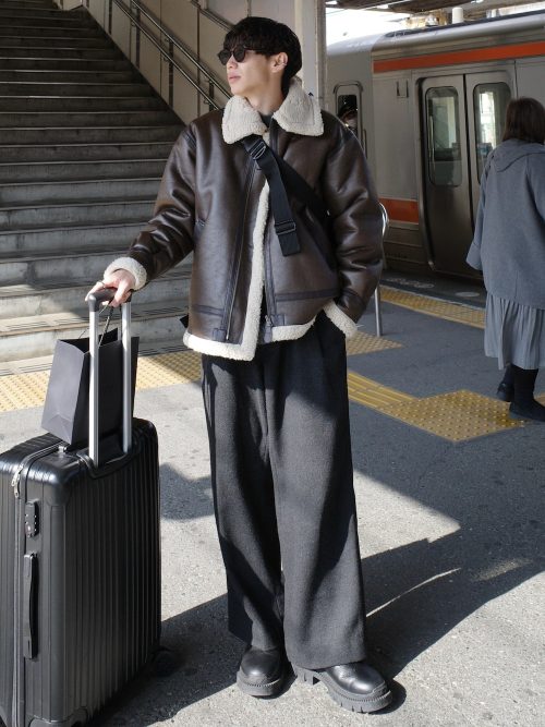 ブラウンのレザーボアジャケットを主役にしたメンズコーデです。襟元や袖口から見える白いボアがあたたかみのあるアクセント。インナーやパンツ、小物をブラックで統一することで、大人っぽくシックにまとめています。
