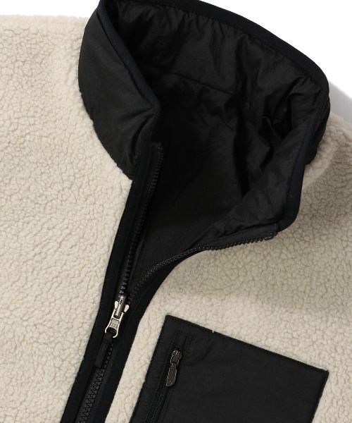 表地と裏地で異なる素材を楽しめるリバーシブルボアジャケットです。表面には保温性の高いボアフリース素材、裏面には防汚性・耐摩耗性・耐久性に優れたパーテックス ダイヤモンドフューズを使用しています。服装にあわせて着こなしを変更できるアイテムです。