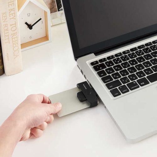 USB-C接続でパソコンに直接挿すだけですぐに使用可能。マイナンバーカードを挿入すれば、e-Taxでの確定申告や各種行政手続きをスムーズに進められます。