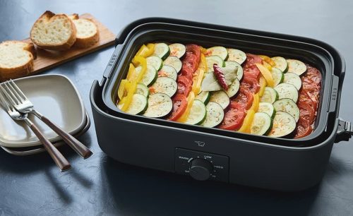 2〜3人前作れるほどのサイズで、毎日の料理はもちろんホームパーティーでも活躍します。平面・たこ焼きのプレートが付属するほか、フタを使った蒸し料理にも対応。最大250℃の高火力で、本格的な料理を楽しめます。