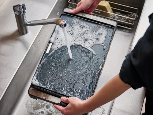 一体型プレート1枚のシンプルなホットプレート。IP6Xの防水性能を備えているため、本体を丸ごと水洗いできるのが特徴です。スリムで軽量なため洗浄も簡単で、隙間に入った食材も水流で洗い流せるため衛生的に使えます。