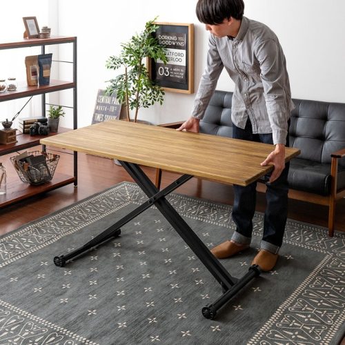 ガス圧式の昇降式折りたたみテーブルです。机の高さを27〜72cmの間で、無段階に調節できるのが特徴。椅子に座ってPC作業をするときは高く、リラックスタイムはローテーブルとして使えます。