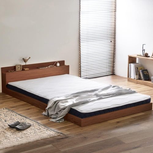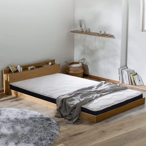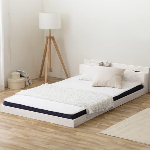 開放的な寝室空間を実現するフロアベッド。床板の高さが9.5cmと低く、圧迫感を抑えた設計が魅力です。ヘッドボードには扉付きの収納棚とオープンスペースを配置。また、2口コンセントを2つ搭載しています。