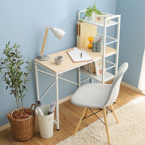 部屋のスペースを有効活用できるラック一体型のパソコンデスクです。天板の脇にラックを取り付けられ、天板と合わせて4段構造のオープンラックを用意できるのが特徴。必要な道具にすぐ手が届くので、作業効率を高めたい方にもおすすめです。